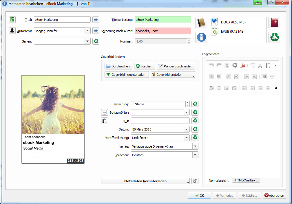 Gib nun Titel, Autor, Herausgeber, ISBN etc. ein. Lade zudem ein Coverbild hoch und akzeptiere alle Angaben per Klick auf „OK“.