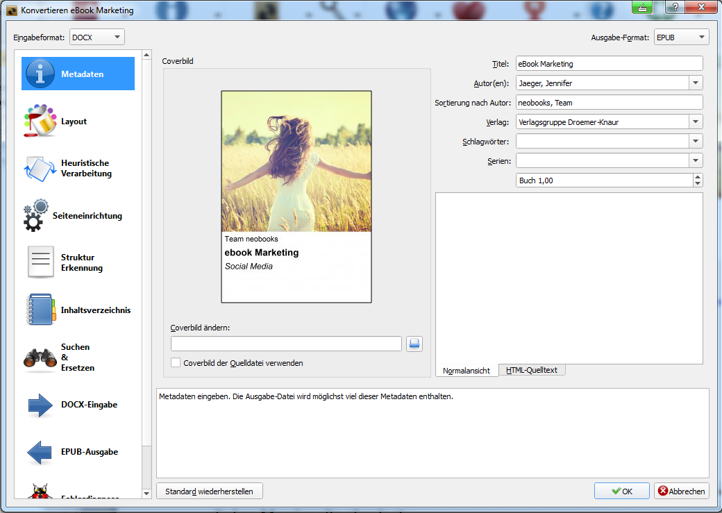 Du kannst hier noch die Formatierungen anpassen, z.B. das Layout und Inhaltsverzeichnis. Wenn alle Einstellungen korrekt sind, klicke auf „EPUB-Ausgabe“ → „OK“.